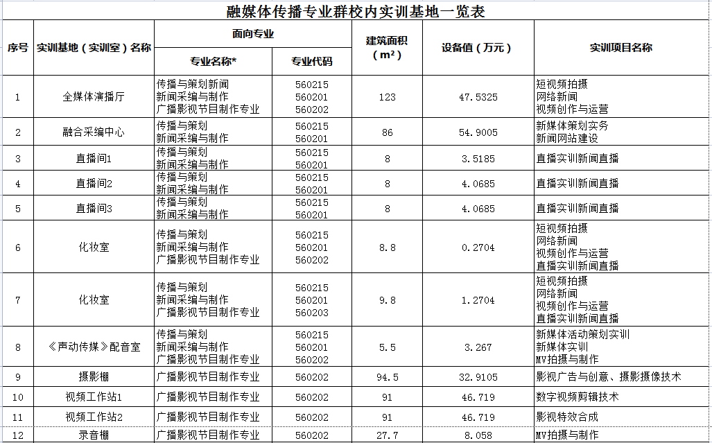 融媒体传播专业群实践教学条件强,设备环境超一流。协同湖北知音动漫有限公司、福建网龙集团等企业,先后投入数千万元,建有省内先进、完备的融媒体中心、知音漫客动漫工坊、虚拟现实实训中心等,校内教学条件包括演播厅、摄影棚、融合采编中心、非线性编辑室、录音棚、直播间、led摄影棚、表演排练厅、琴房,建有新媒体工作室、配音工作室、短视频工作室、动漫工作室、VR/AR工作室等,可供千余名师生开展全方位教学实训任务,能充分满足各类策划、内容制作的需要,能实现微电影、影视剧、短视频、动画片等音视频作品的拍摄与创作,满足活动录制、创意节目录制等要求。能进行影视、话剧、播音主持等演艺人才声、台、形、表的训练,能进行融合媒体产品制作、全媒体平台一键分发的生产性实训。学校力争将特色化教学与融媒体生产紧密结合,以产业需求为导向,将各实训基地集成打造成集信息热点策划、生产制作、多元分发于一体的融媒体智能化产教平台,形成具有武信特色的、立体化的校园媒体矩阵、省内高素质融媒体人才培养基地。