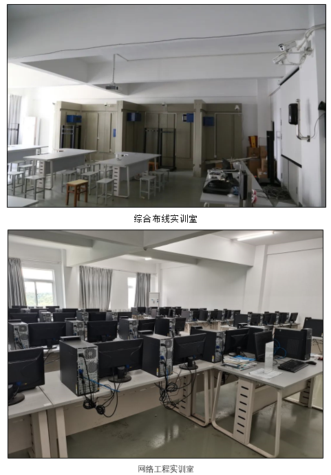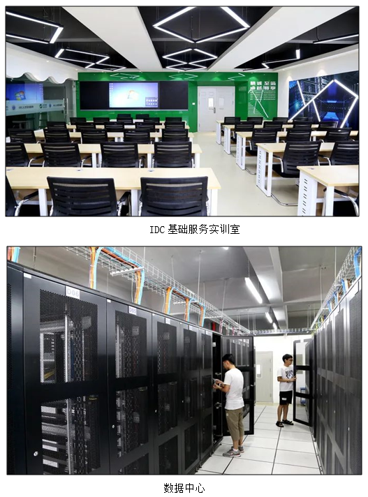 IDC人才培训基地拥有实训室4间,数据中心1个,基地拥有服务器80台,路由交换设备100余台,工位200个,主要承担计算机网络技术专业课程教学任务。