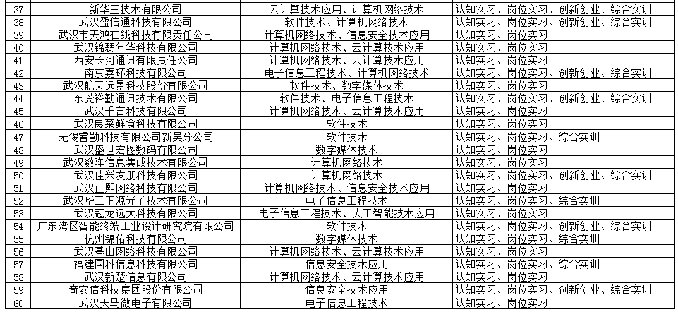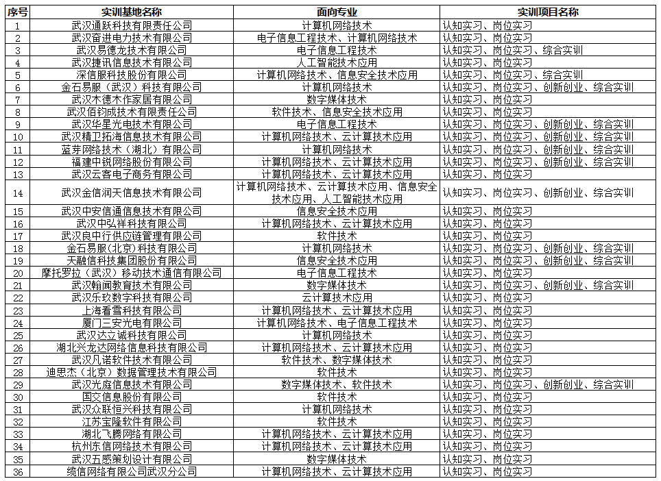 近年来,信息工程学院现代信息技术专业群紧密对接新一代信息技术产业,群内各专业不断深化校企业合作,其中:云计算技术应用专业与新华三技术有限公司、武汉金信润天信息技术有限公司等企业共建校外实训基地,为学生提供云计算实施、云计算运维、云平台管理等实习实训岗位;人工智能技术应用专业与阿里云计算有限公司等企业共建校外实训基地,为学生提供数据标注、人工智能运、智能系统部署等实习实训岗位;信息安全技术应用专业与奇安信科技集团股份有限公司、天融信科技集团股份有限公司、深信服科技股份有限公司等企业共建校外实训基地,为学生提供网络安全运维、应急响应、渗透测试等实习实训岗位;软件技术专业与武汉光庭信息技术有限公司、东莞裕勤通讯技术有限公司等企业共建校外实训基地,为学生提供网站开发、前端设计、软件测试等实习实训岗位;计算机网络技术专业与金石易服(武汉)科技有限公司、武汉盈信通科技有限公司等企业共建校外实训基地,为学生提供网络系统管理、集成交付、系统运维等实习实训岗位。截止到目前,专业群共建立了60余家校外实训基地,为相关专业学生提供了足够的实习实训岗位,保障了学生的专业学习综合性认知与实践,实现了学校和企业的无缝对接。