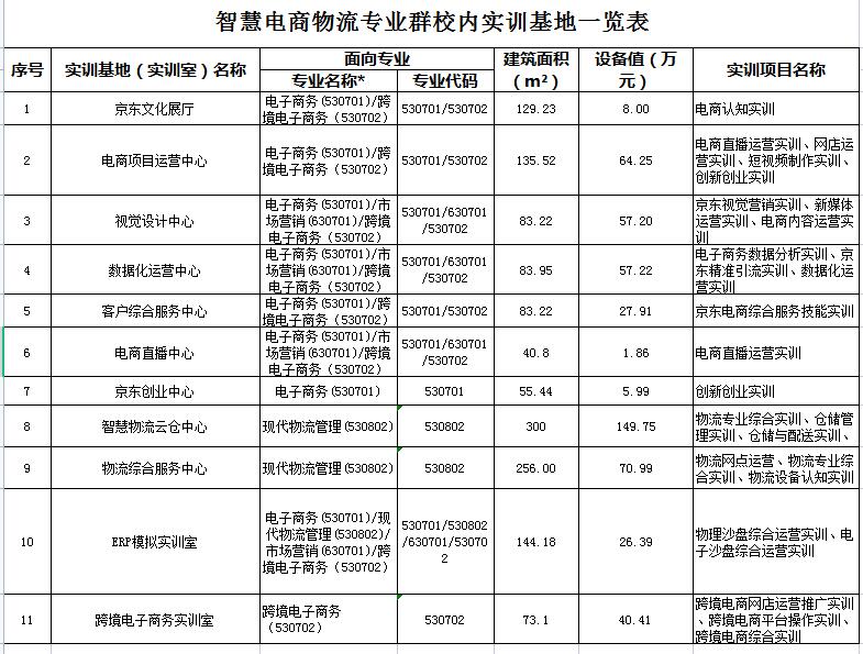 智慧电商物流专业群校内实训基地总面积1300余平方米,建有京东企业文化展厅1间、视觉设计中心1间、数据化运营中心1间、客户综合服务中心1间、电商项目运营中心1间、电商直播中心4间、智慧物流云仓中心1间、京东创业中心1间、物流综合服务中心1座、ERP模拟实训室1间、跨境电子商务实训室1间等。实训基地配备200余台高性能台式计算机,安装有“京东电商实训系统”1套、轻型无轨AGV搬运车3台、智慧仓储管理系统J-WMS 1套、物流站点3PL管理系统1套、菜鸟驿站管理系统1套、手持终端设备4套等,总金额达500余万元,能够同时满足300余人进行理论学习和实践操作,形成集“训(实习实训)、研(教育教学)、创(创新创业)、服(社会服务)”四位一体,对接产业成效明显、人才培养质量高的智慧电商物流产教融合实训基地。