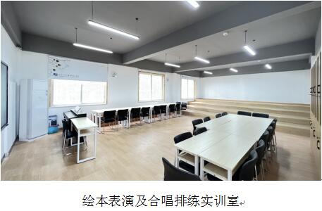 3.绘本表演及合唱排练实训室:满足了双语儿歌弹唱、乐理及视唱练耳、幼儿经典绘本导读等课程的实践教学。学生平时可以在这里研读绘本,进行幼儿园语言活动课程模拟,也可以进行声乐训练。