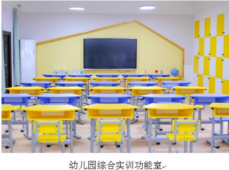 6.幼儿园综合实训功能室:还原了幼儿园教室真实场景,通过区域划分将实景建设和教学开展进行融合,学生在这里针对幼儿园一日活动开展模拟教学。