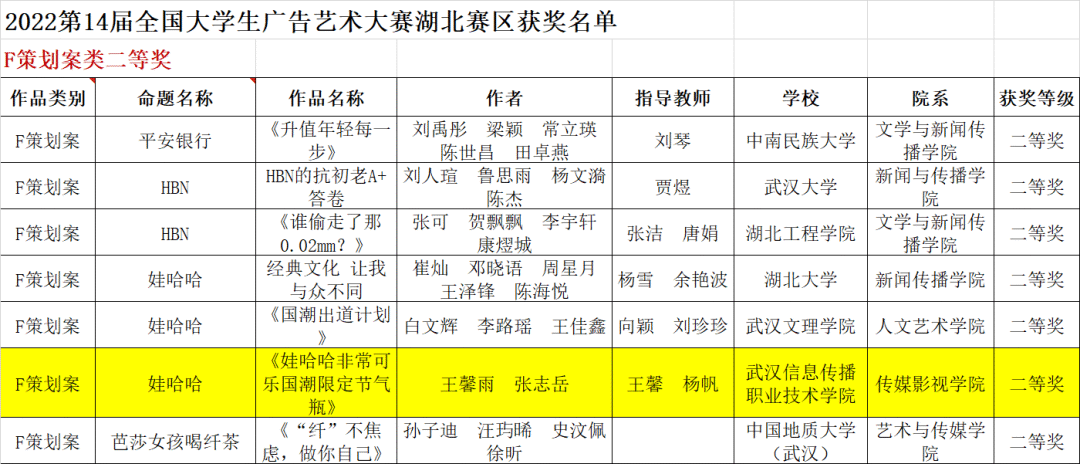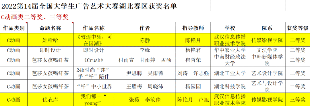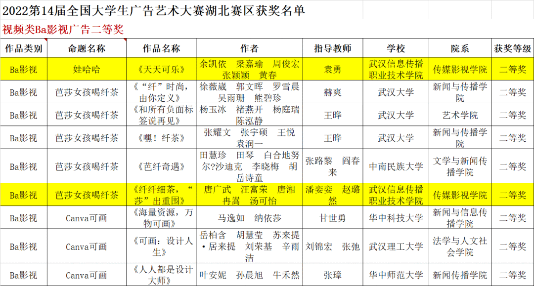 近日,第十四届全国大学生广告艺术大赛湖北赛区评审结果揭晓,我校传媒学子共有22件作品获奖。其中二等奖4项、三等奖4项、优秀奖14项。获奖作品类型涵盖平面类、影视类、动画类、广播类、策划案类,获奖数量较往年再创新高。这是我校融媒体传播高水平专业群(A档)实力和水平的又一次展现。