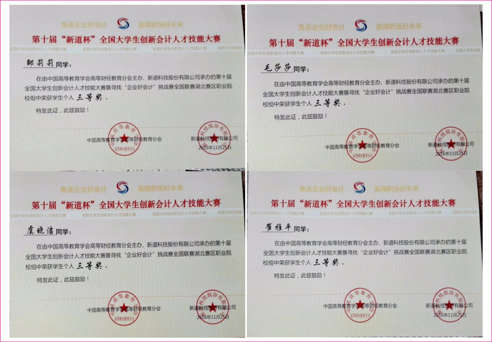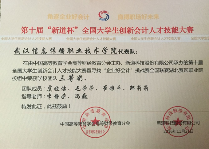 近日,第十届“新道杯”全国大学生创新会计人才技能大赛暨寻找“企业好会计”挑战赛在汉落幕,我校会计专业由虞晓洁、毛莎莎、催雅平、邹莉莉组成的参赛团队在李静荣、冯巍两位老师指导下,奋勇拼搏,荣获湖北赛区团体三等奖,四名同学还均获得了个人三等奖。