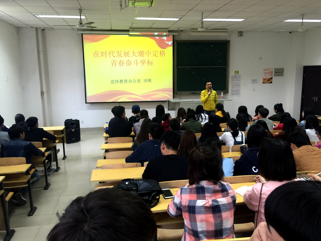 田维老师首先从古人修身齐家治国平台下的家国情怀出发,以中国近代以来历史发展为纵坐标,从落后就要挨打到新青年新文化的兴起,从中国共产党成立到党领导中国革命和建设,从大国崛起到新时代青年发展的大好机遇,阐述了当今青年有梦想,青年有可为。讲课中,田维老师还不乏列举了毛泽东、周恩来、习近平等几代共产党人在青年时期立下的壮志豪言,分享了他们的青春奋斗故事,剖析了当前大学生中存在的一些浮躁现象,引发同学们深深思考。