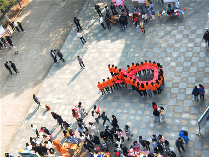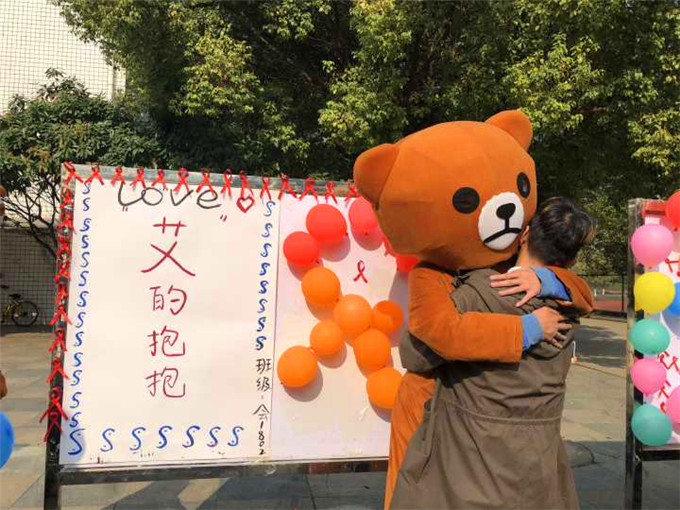 今年的活动中,彩虹志愿队除开展了艾滋病防治基本知识宣传、测试外,还组织了班级海报大赛、进社区宣传、和网络点亮红丝带等活动。其中,重点组织开展了“防艾嘉年华”活动。参与的2018级班级中,电子商务1803班“‘艾’心连连爆”,通过将艾滋病知识隐藏在气球核心,让参与者在神秘的期待下完成知识测试;会计1802班“ ‘艾’的抱抱”,一只可爱的人扮艾滋病玩偶与同学们展开爱的抱抱,受到了很多同学的欢迎,充分展示了大学生反对歧视艾滋病,关爱艾滋病患者的平等态度。同学们还通过展板,书写了祝福的卡片和寄语。活动的最后,志愿者们摆出了一个巨大红丝带造型,希望大家牢记红丝带的寓意,呼吁更多的同学了解艾滋病、知艾防艾,既做防艾的宣传员,也身体力行做到校园无艾。