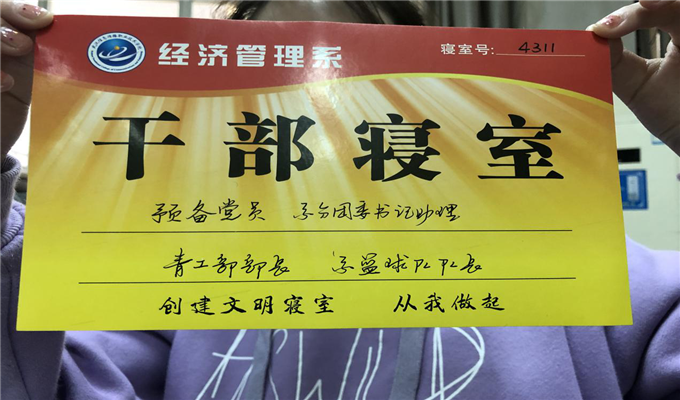 创建文明寝室、干部先行。为充分发挥全系团学干部的骨干作用和示范效应,增强室友之间的凝聚力,巩固室友之间的友谊,合力创造美好生活空间,4月2日,经济管理系分团委举行“学生干部”寝室挂牌活动启动仪式,正式拉开了该系本年度文明寝室创建活动的序幕。