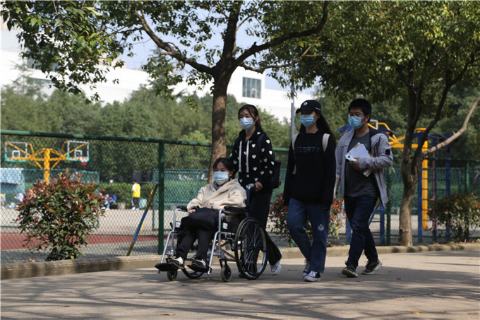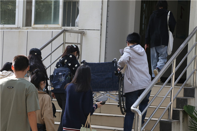 一名身有残疾的女生坐在轮椅上,身边几位同学有说有笑推着她往返于教室和寝室,课马上开始了,同学背起她走向楼上的教室,后面同学小心地护卫着。
