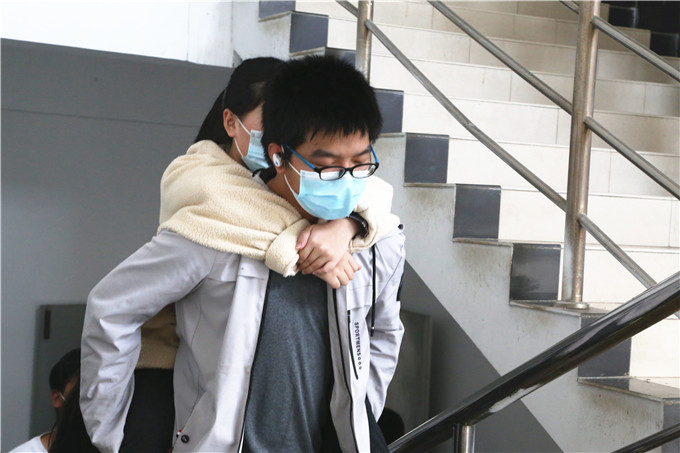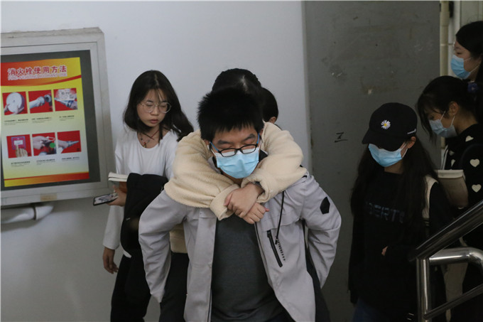 刘家慧背董子涵下宿舍楼,闵娟(左一)等同学一起协助