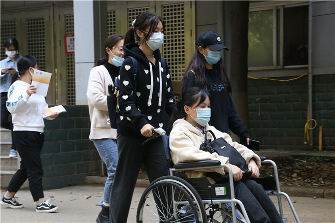 “今天想吃什么?”到了饭点,董子涵同宿舍的女同学为她打饭、辅导功课,推着轮椅散步,代办个人学习生活中的相关事宜,大家亲如一家。