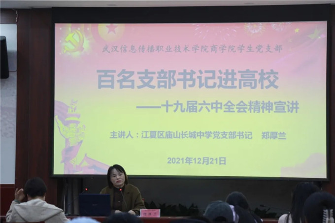 为抓好青年学生思政教育,深入学习贯彻党的十九届六中全会精神"十进十讲”大宣讲要求,我校商学院学生党支部特邀江夏区庙山长城中学党支部书记郑厚兰走进武信作专题宣讲,为近百位学生党员和入党积极分子送上了一场精彩的党课。