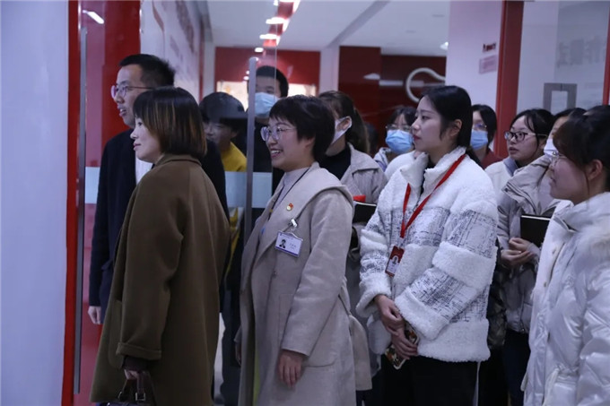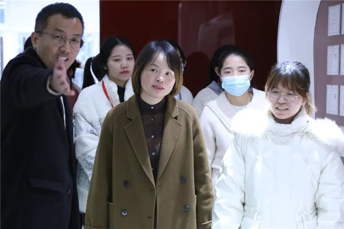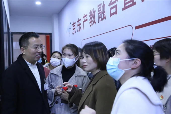 宣讲活动后,与会人员前往京东产教融合基地实地参观。电子商务专业学生预备党员易慧敏介绍了电子商务专业、现代物流管理专业的基本情况和学习内容,带领来宾观看了学生电商直播的工作情形,并介绍了同学们发挥技能特长进行网络推广助农扶贫的情况。