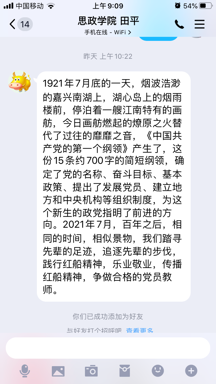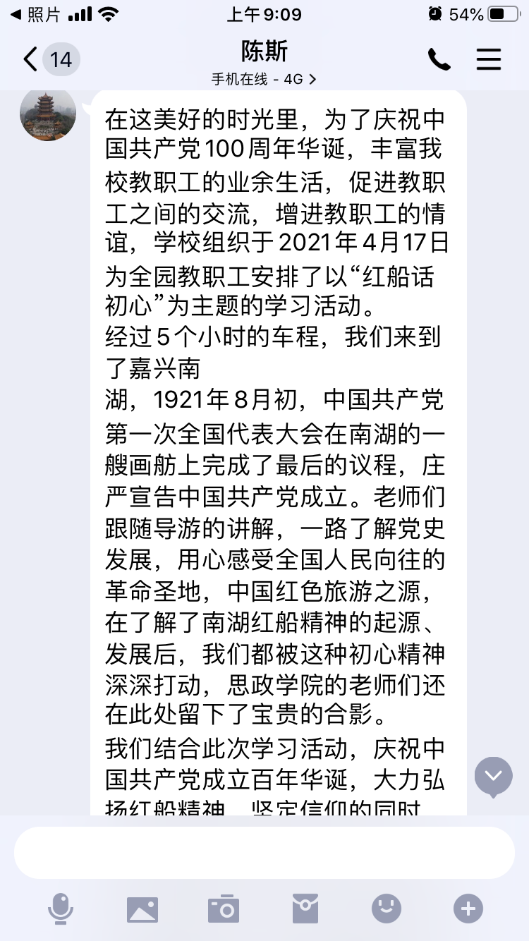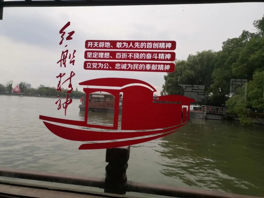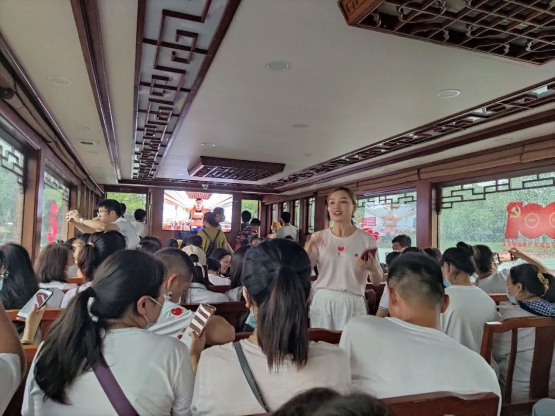 随后我院党员教师秩序井然,到达码头,乘坐红船去往湖心岛。湖面波光粼粼,岸边杨柳依依,红船朱栏金檐。在船内,思政教研室程朝老师循着革命先辈的足迹,追忆光荣的建党历史,向大家讲述了十月革命胜利后,马克思主义开始在中国得到更加广泛的学习、研究与传播,中国共产党第一个组织的诞生以及中共一大的召开过程等历史。最后全体党员同志在孙专老师的带领下齐唱《没有共产党就没有新中国》,抒发对我们党崇敬和热爱之情。在这个过程中,全体党员同志加深了对建党的历程、对开天辟地、敢为人先的首创精神的认识。