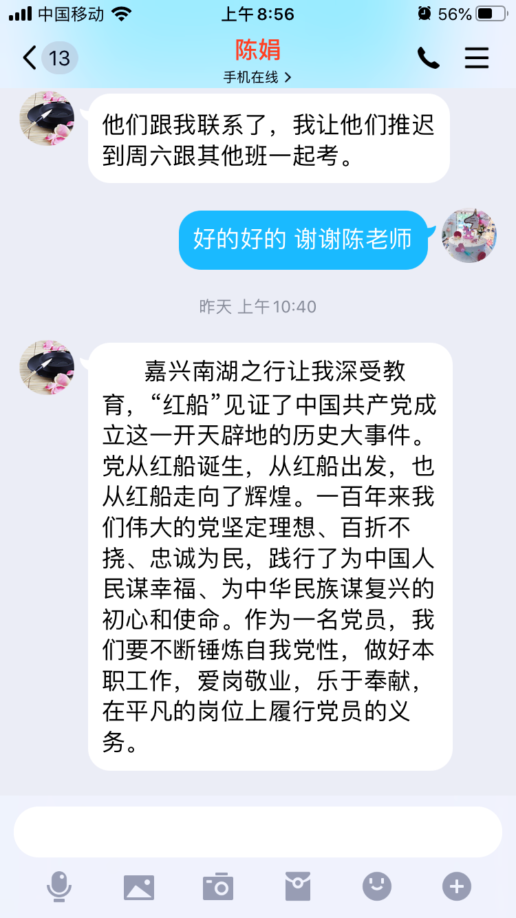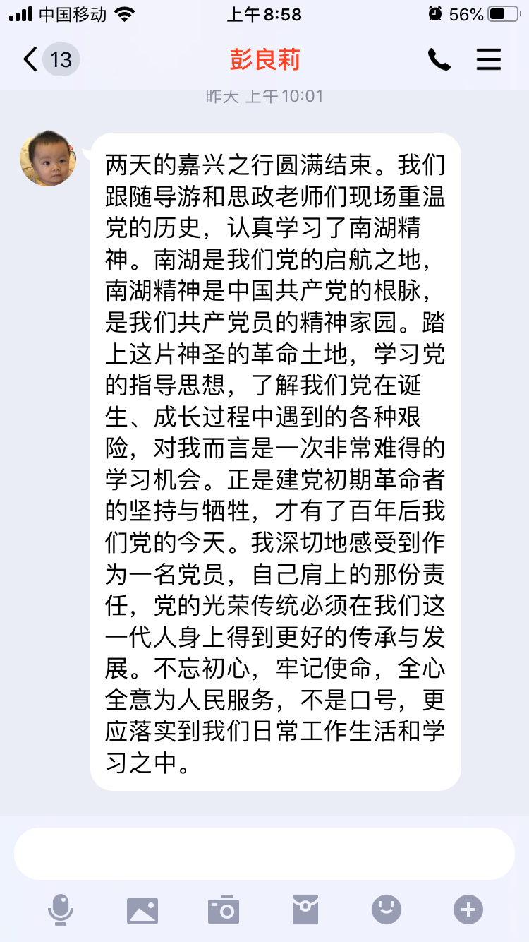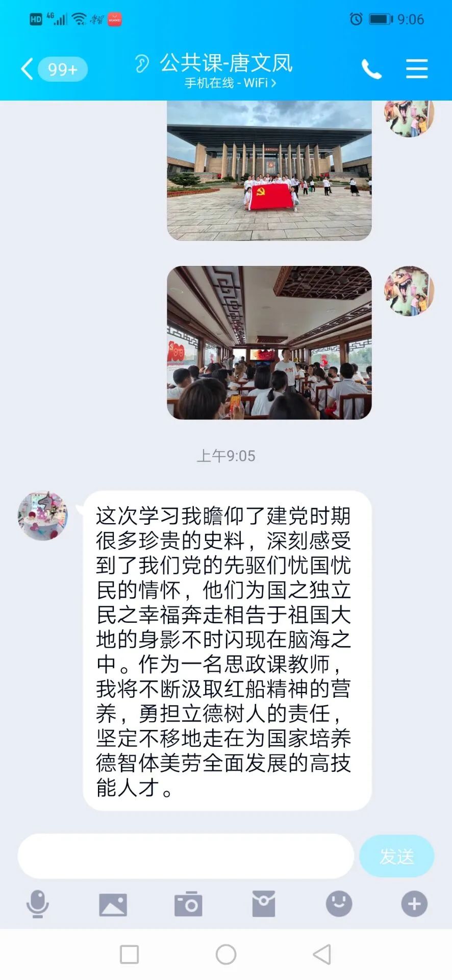 这次红船之旅,大家对党的诞生、成长历程有了更为全面深刻的认识,激发了党员们要珍惜来之不易的今天,坚定了理想信念,更坚定了大家继承光荣革命传统的信心。党员同志们纷纷表达了自己的学习感悟。冯影影书记说到:“带领党员共同重温入党誓词,接受了一次震撼灵魂的党性教育。作为教育工作者、党务工作者,我将在工作和生活中践行誓词中的承诺,听党话,感党恩,跟党走。”思政教研室主任孙瑛同志说到:作为一名思政课党员教师,我深切感受到“红船精神”作为中国革命精神之源,是我们共产党人奋斗的初心和使命,在这个新的时代,我们更要把永恒的誓言铭记于心,不忘初心,牢记使命!基础课教研室主任陈娟老师说到:嘉兴南湖之行让我深受教育。作为一名党员,我们要不断锤炼自我党性,做好本职工作,爱岗敬业,乐于奉献,在平凡的岗位上履行党员的义务。彭良莉老师说到:不忘初心,牢记使命,全心全意为人民服务,不是口号,更应落实到我们日常工作生活和学习之中。唐文凤教师感叹道:这次学习我瞻仰了建党时期很多珍贵的史料,深刻感受到了我们党的先驱们忧国忧民的情怀,他们为国之独立民之幸福奔走相告于祖国大地的身影不时闪现在脑海之中。作为一名思政课教师,我将不断汲取红船精神的营养,勇担立德树人的责任,坚定不移地走在为国家培养德智体美劳全面发展的高技能人才。