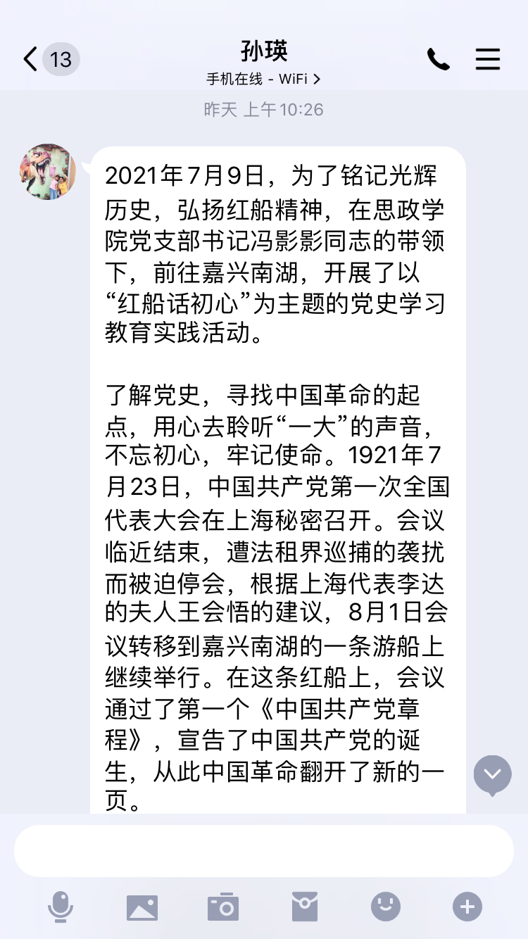 中国共产党成立100周年之际,为更深刻领悟和践行红船精神,7月9-11日,在思政学院党支部书记冯影影的带领下,全院13名党员教师前往嘉兴、苏州开展“红船话初心”党史学习教育实践活动。大家怀着崇敬的心情参观了南湖革命纪念馆,瞻仰了南湖红船,参观了沙家浜红色教育基地、太湖革命纪念馆,沿着早期共产党人的足迹,探寻我党初创经历,学习践行红船精神,重温党的光辉历程。