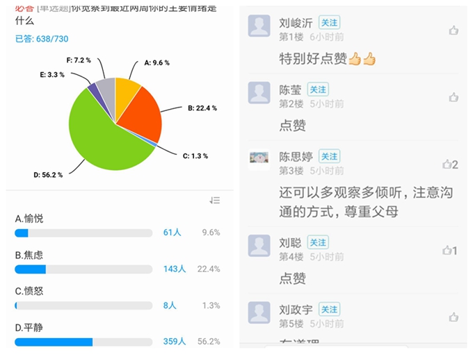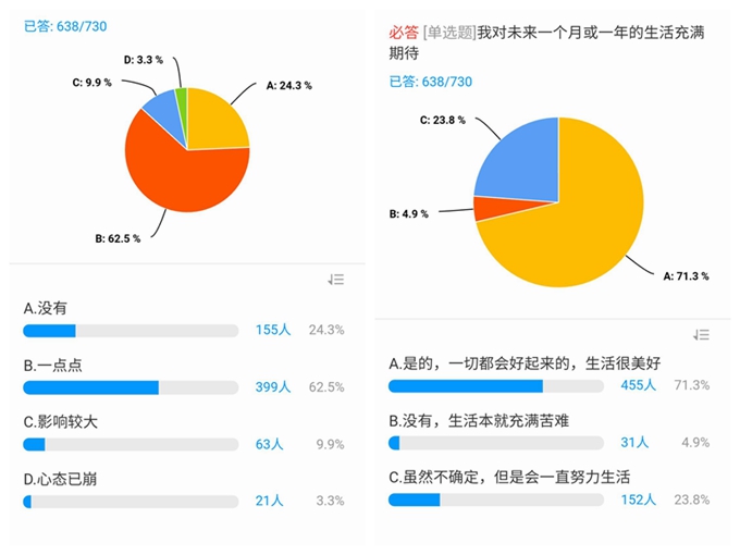 问卷调查,了解学生心理状态。为更有针对性地做好疫情期间的教学,课程组老师在“学习通”平台上向授课班级发布调查问卷,从近期主要情绪是什么、睡眠有无影响、对未来一段时间生活是否有信心等方面了解学生的实际心理状态。从参与调查的学生数据来看,约60%的同学表示情绪受到一点点影响,约25%的同学表示未受到影响,约56%的同学当下情绪为平静,23%的表现为焦虑,约70%的同学对未来生活充满期待,还有25%的同学虽然不确定未来会怎样,但表示会努力生活。