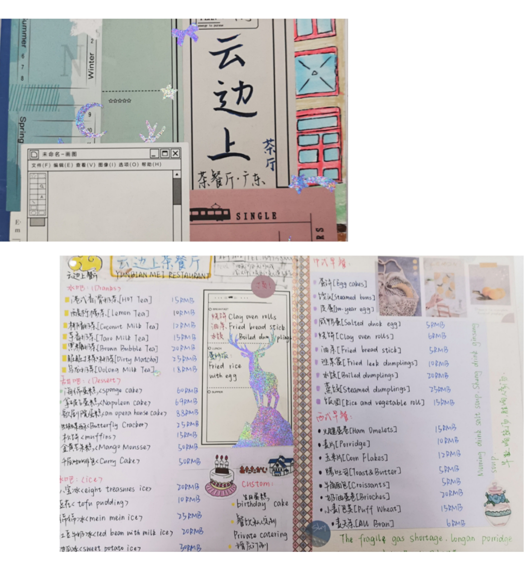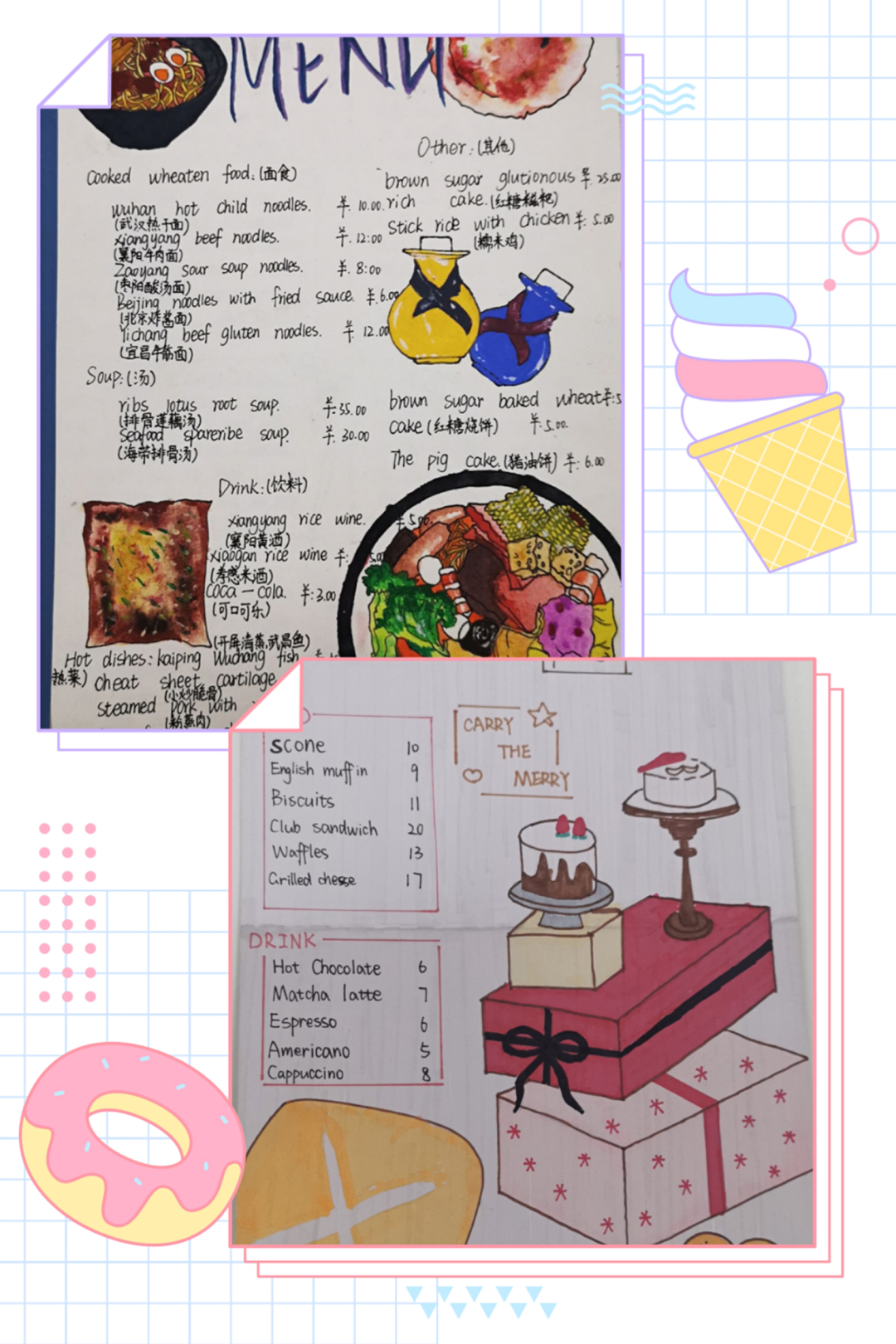 结合单元教学主题Yummy Food,开展“英文小菜单,放眼大世界”英文菜单设计实践活动,提高学生的英语应用能力、动手能力和创新能力。学生们从菜单色彩、菜名、菜点内容、材质等方面进行大胆的创新,设计出既有新意,又具有实用性的独特英文菜单,中餐、西餐、特色小吃、酒水饮料、花式甜点,数不尽的英文美食菜单均出自于2020级学生的一双双巧手中,图文并茂、新颖别致、生动形象,得到了一致好评。