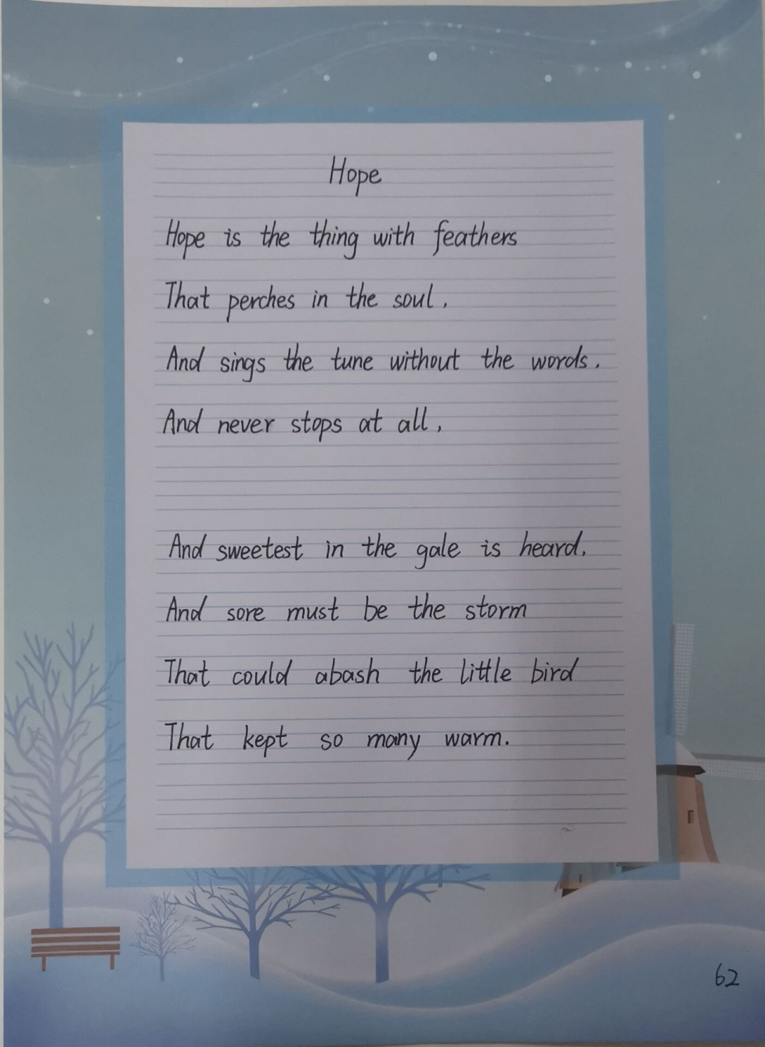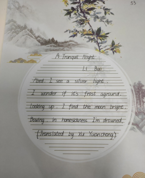 古人云:字如其人。“最美英文笔迹”旨在帮助学生培养良好的英文书写习惯,打好坚实的英语书写功底,营造浓厚的英语学习氛围,提升人文素养。2020级学生积极参与到实践项目中,用最美笔迹书写了英文经典诗歌、英译版中文经典古诗词、励志英语短文、教材重点段落等,展示了扎实的功底,字母书写标准,字迹流畅端正,卷面整洁漂亮,令人赏心悦目。