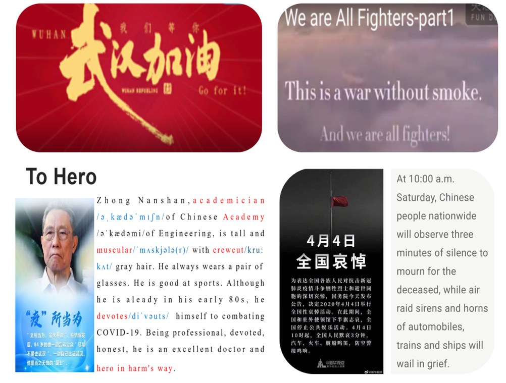 英语课程组结合教学内容,在英语线上课堂讲解疫情相关的高频英文词汇,播放钟南山、张文宏、世卫总干事等专家对新冠肺炎的英语访谈小视频,力求从科普的角度说明病毒的传播途径及防护方式,帮助学生减少恐慌,保持积极乐观,做好自我防护工作,做到科学防疫。