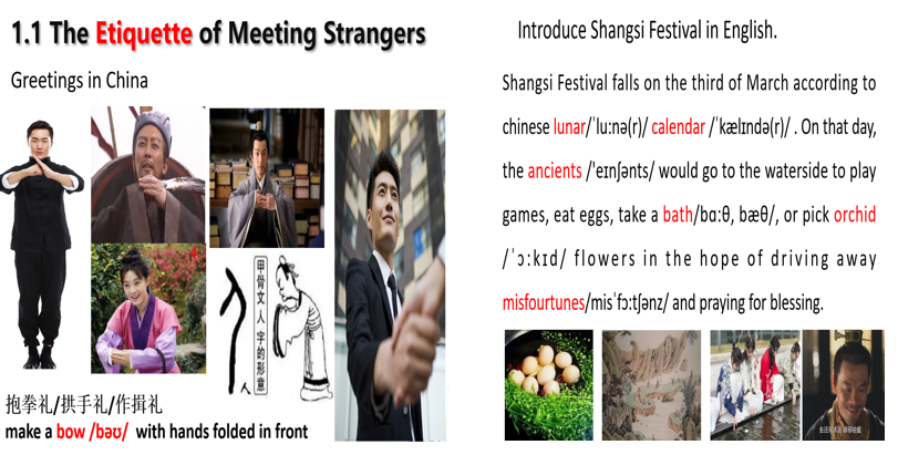 英语课程组积极探索课程政治元素如何与教材的单元主题、课文教学、词汇教学和练习任务等各环节紧密结合,如:在“The Etiquette of meeting strangers”教学环节中,融入中国的抱拳礼、拱手礼、作揖礼(make a bow with hands folded in front);在“The Business Card”教学环节中,融入名片在中国的发展历史;在“Festival”教学环节中,结合上课时间节点,融入Spring Festival、Shangsi Festival、Tomb-sweeping Festival等传统节日的英文介绍;在“My favourite book/poem”教学环节中,融入中国经典诗词的英文赏析;在“Family”教学环节中,结合医护人员、志愿者等逆行者舍小家、为大家的忘我精神,融入家国情怀的教育。