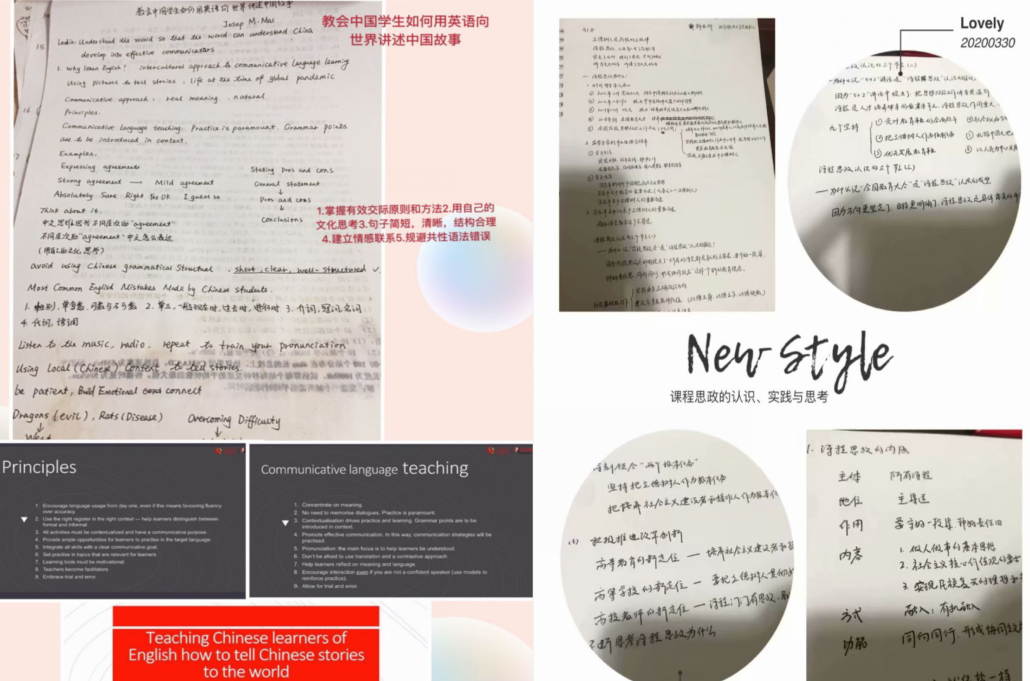 疫情期间,英语课程组老师们见屏如面,同频共振。以上好“疫情防控”这堂爱国主义教育大课为契机,英语课程组积极参加线上师资培训,自我充电,将课程思政有效地融入疫情期间的线上教学,撰写学习笔记、反思笔记。同时创新集体备课方式,通过腾讯课堂、钉钉等召开“线上集体备课研讨会”,同课异构,协同共研,精心打磨课程,从教学设计、情感教学、线上互动、任务单等方面入手,引导学生用英语讲述战“疫”的中国故事,用英语发出战“疫”的中国声音,传递必胜的信心和力量。线上教、学、研,育人者先育己。