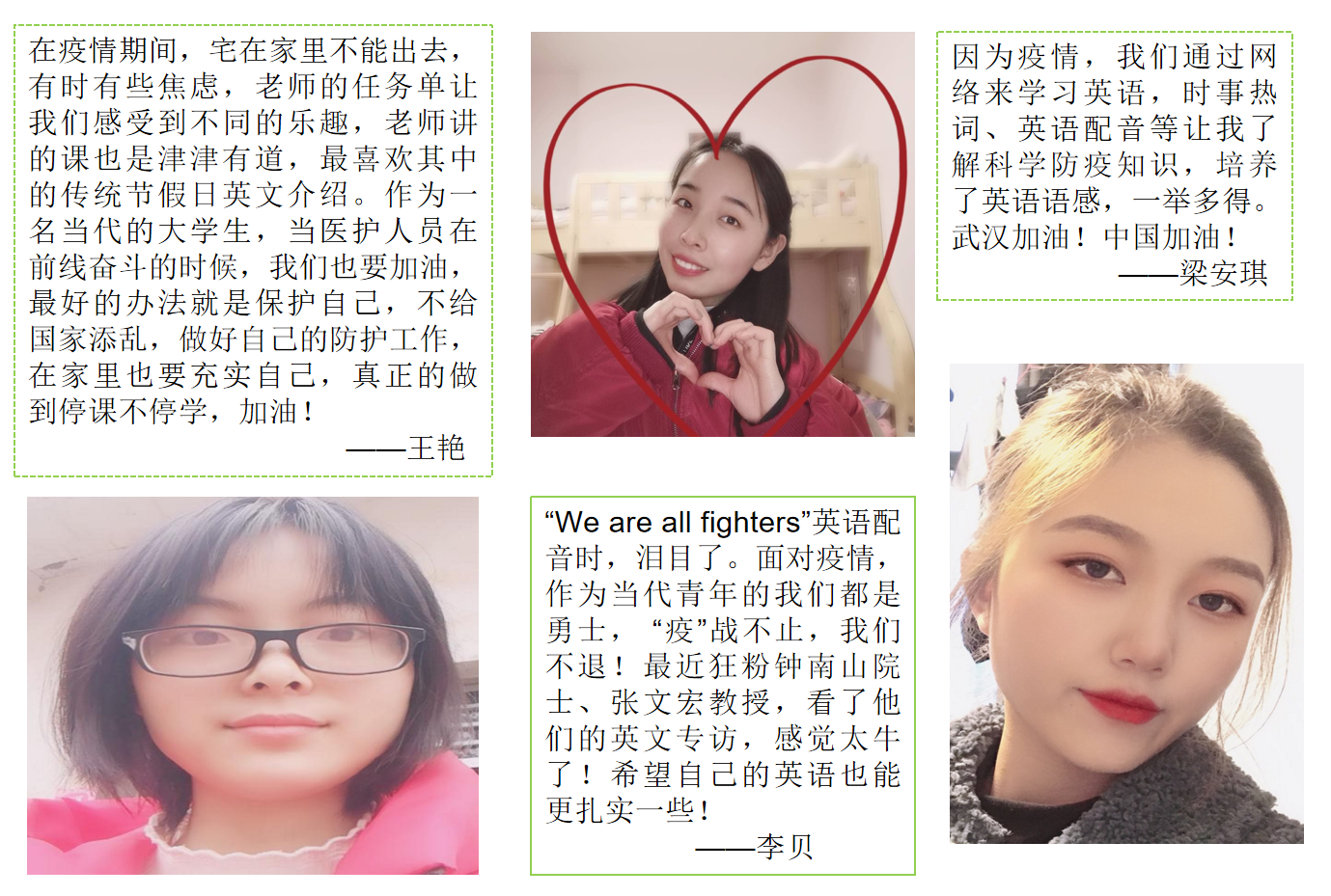 英语课程组组织学生关注中国日报双语新闻微信公众号和“学习强国”学习平台,引导学生每天收听、阅读头条英文播报。组织“We are fighters”、“Wuhan,go for it”等主题相关的英语配音,组织“To hero”等主题相关的英文朗诵,“My motherland and me”等主题相关的英文歌曲吟唱,引导学生通过不同形式,运用语言的输出功能,表达自己的感受和观点,凝练疫情特殊时期的“中国精神”。