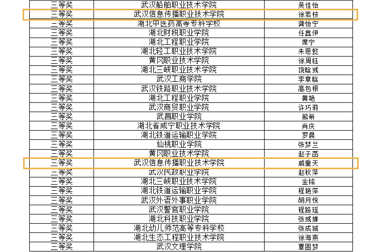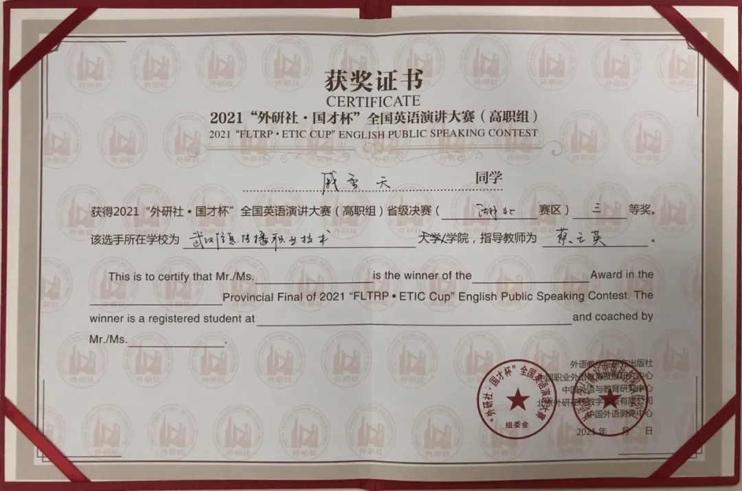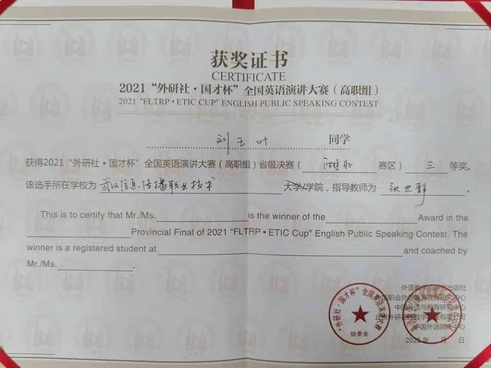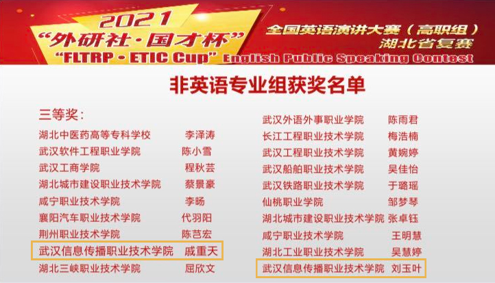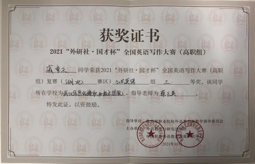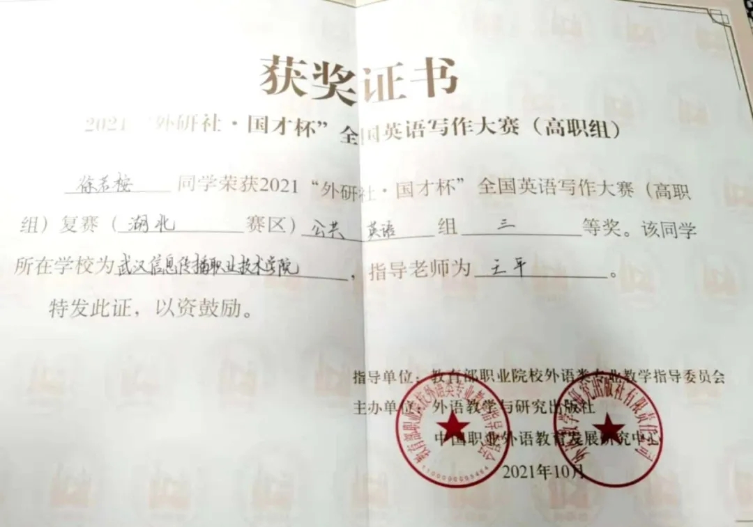 在10月31日的2021“外研社·国才杯”全国英语写作大赛(高职组)湖北省复赛上,戚重天同学(指导教师:蔡玉英)和2020级新闻采编制作专业的徐若桉同学(指导教师:王平)一起,再添两项三等奖,为我校赢得了荣誉。