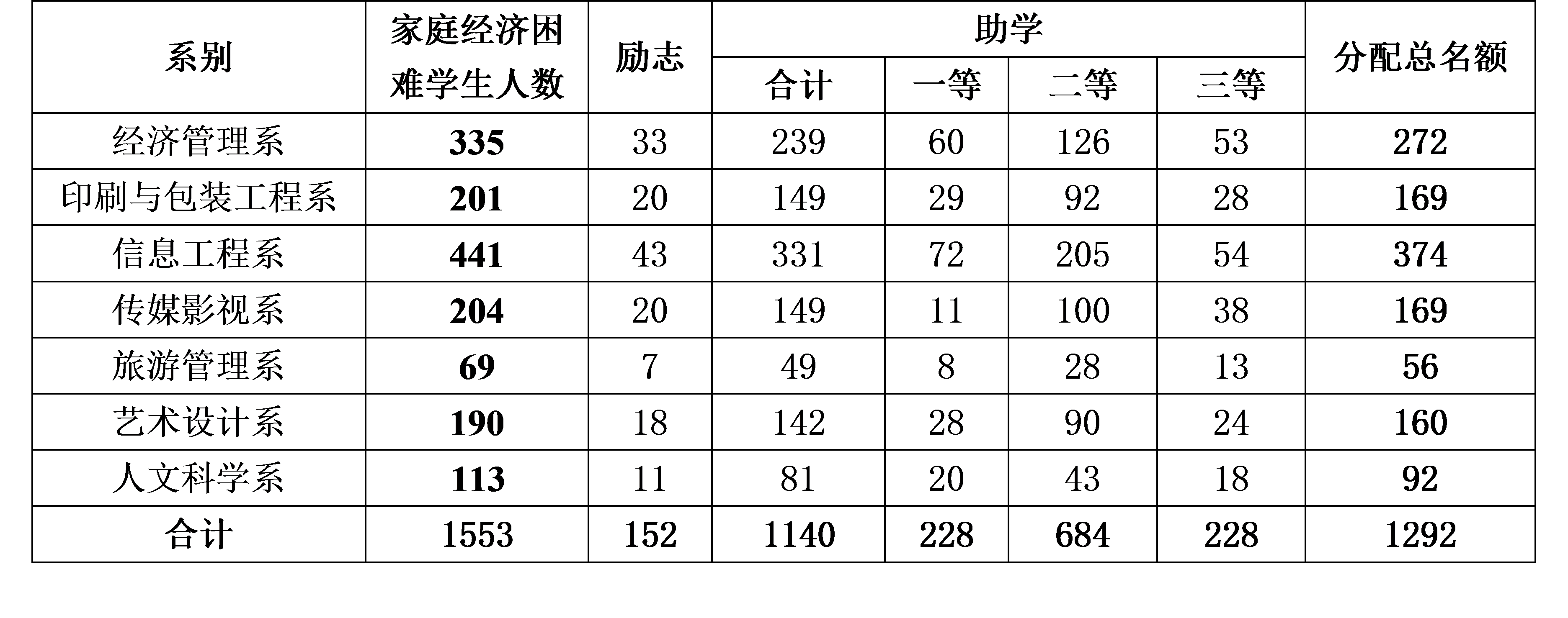 2016年湖北省学生资助管理中心分配我院国家励志奖学金名额共152名,资助标准为5000元/人/年;国家助学金名额共1140名,其中一等助学金4000元/人/年,二等助学金3000元/人/年,三等助学金2000元/人/年,国家助学金分两次发放,此次只下拨秋季学期奖金,即按人均1500元/学期。国家励志奖学金和国家助学金的系部名额分配详见下表。