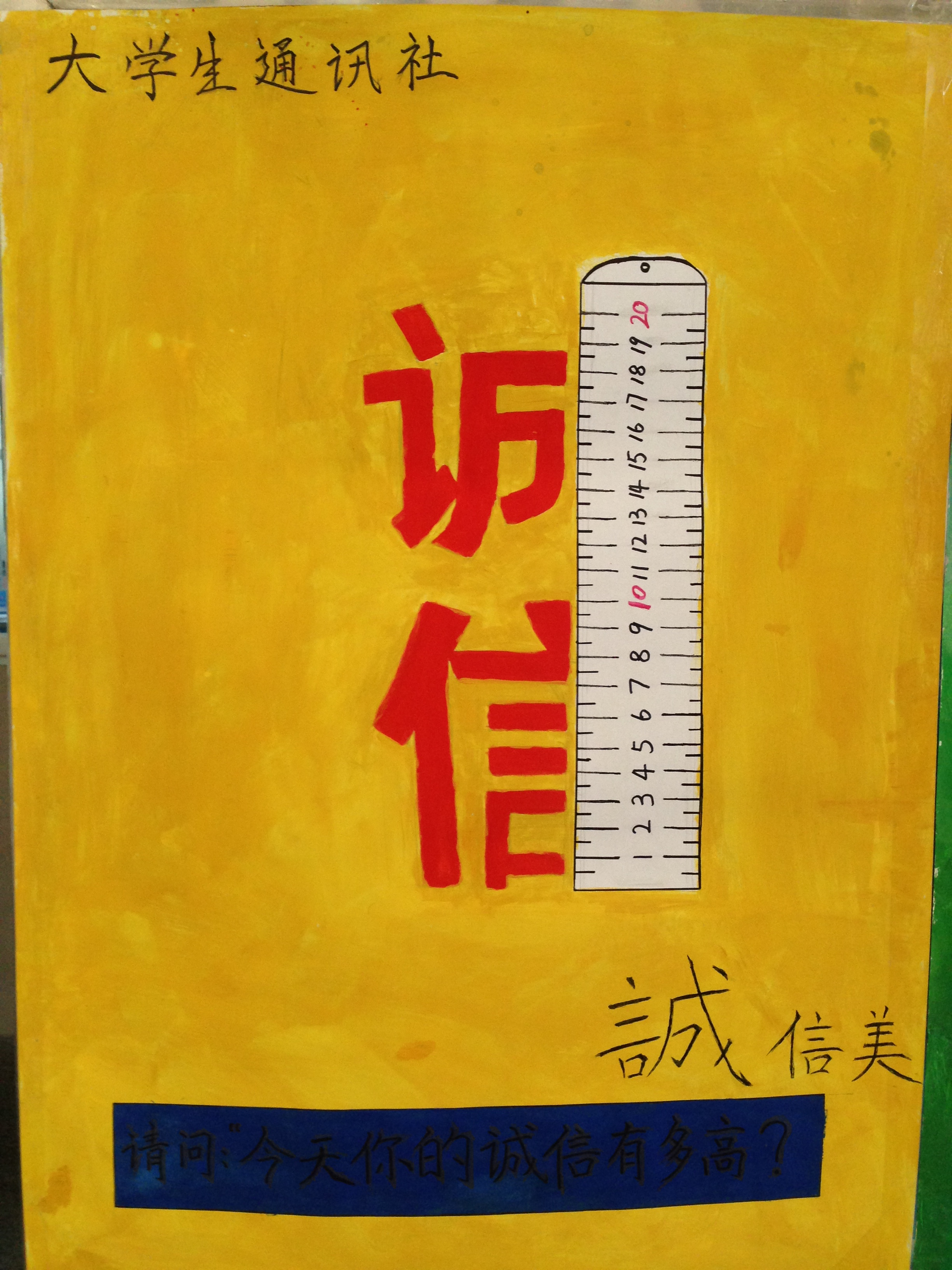 本次诚信主题教育活动分为诚信主题海报展、诚信微接龙、毕业生生源地贷款诚信还贷培训三个部分。在海报展活动中,各系和校级组织集思广益,用创意和色彩描绘出我校大学生心中的诚信分量。如:印刷与包装工程系用传统的红色剪纸刻画出“言必诚信、行必忠正”的誓言,校社联以大大的指纹按出“诚信”力量,除此之外,还通过各系微信平台专门推出了倡导诚信的主题文章,以微接龙的形式在同学们中间传阅。在2017届毕业生返校之际,学生资助管理中心还组织生源地贷款的全体毕业生进行了还贷专题培训,教育引导毕业生按时还贷,维护好个人良好征信。