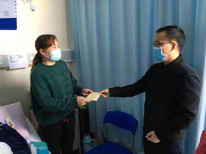 到达病房后,尤敏副校长首先向董关键同学及其家长转达了学校党委和全校师生的亲切问候,并将学校的慰问金交到董关键同学母亲的手中。交谈中,尤敏副校长详细询问了董关键的治疗和康复情况,鼓励董关键同学坚强地面对疾病,勇敢同病魔作斗争,积极配合医生治疗,早日康复回到学校,与同学们一起继续学习。董关键同学以其阳光心态回复了校领导的慰问和期许,其母亲不断向学校老师道谢。