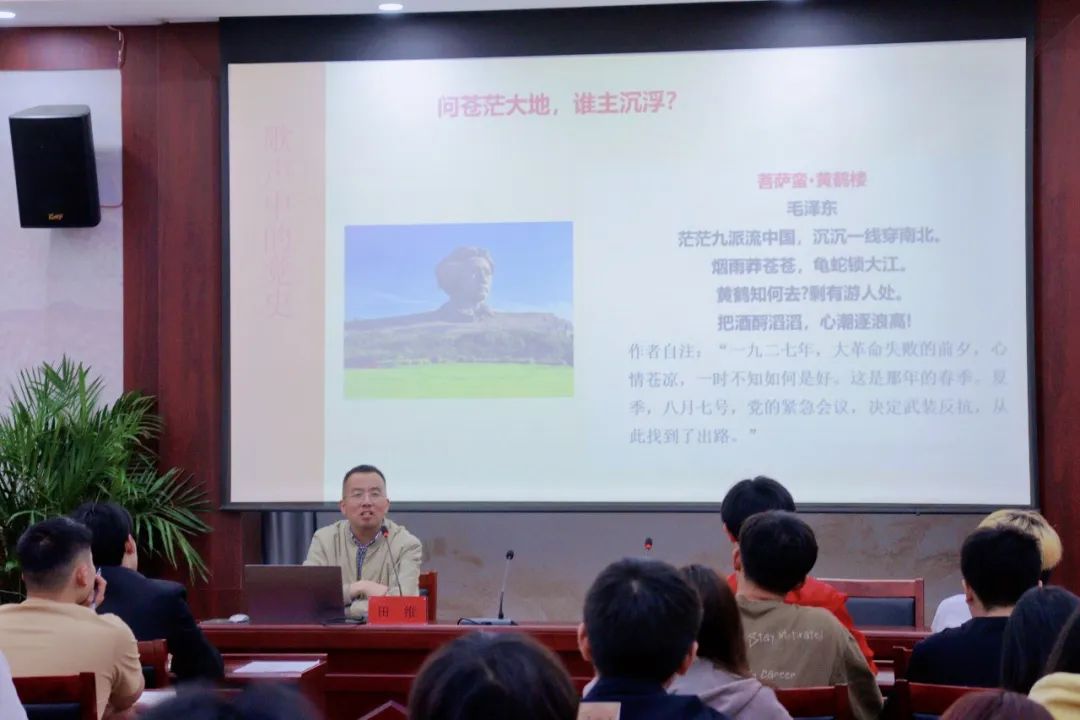 田维老师以“歌声中的党史”为题,以红色革命歌曲为引,以党的百年历史为脉络,通过不同时期的红色歌曲生动讲解党的奋斗历程。从党的早期领导人英勇就义时高唱的《国际歌》到《黄河大合唱》发出的民族怒吼,从《十送红军》的鱼水情深到《我的祖国》的豪迈表达,从《马兰谣》的科学家精神到《走向复兴》的铿锵前行……田老师选取了中国共产党在革命、建设和改革不同时期的代表性歌曲,深入讲解歌曲创作背后的时代背景和历史事件等。