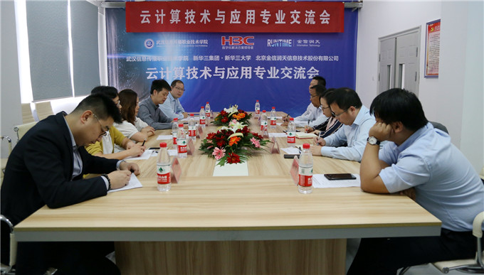 签约仪式结束后,在我校副校长孙翔的陪同下,两家企业代表一行赴实训楼参观了云计算技术与应用实训室,校企双方深入地了解了实训室的使用功能以及先进的信息化技术。随后,校企双方围坐一团,共商合作大计,双方围绕我校网络技术专业群建设开展了广泛的研讨。信息工程系主任蔡明介绍了专业群建设与改革的基本情况,分享了近年来网络技术专业群、湖北省高职特色专业、导师工作室“双师”课堂等建设成果。交流中,门保丰董事长提出,企业参与育人要有情怀,要富有社会责任感,专业共建需要我们政校行企的多元参与,不断强化协调机制建设。金信润天作为新华三的战略合作伙伴,长期从事网络技术服务业务,也愿意携手学校、新华三做好人才精准培养,服务新华三产业链、人才链。目前,校企合作的舞台已经搭建好,需要我们锻炼打造一支双师教师团队。新华三大学大数据学院院长刘朝晖提出,当前高职育人要紧抓行业,这次合作就是契机。新华三大学愿意支持云计算技术与应用专业深化发展,今后无论在人才标准化,还是在教学数字化方面新华三都愿意投入大量精力,也愿意与学校分享共享企业的丰富资源,以提升人才共育质量。