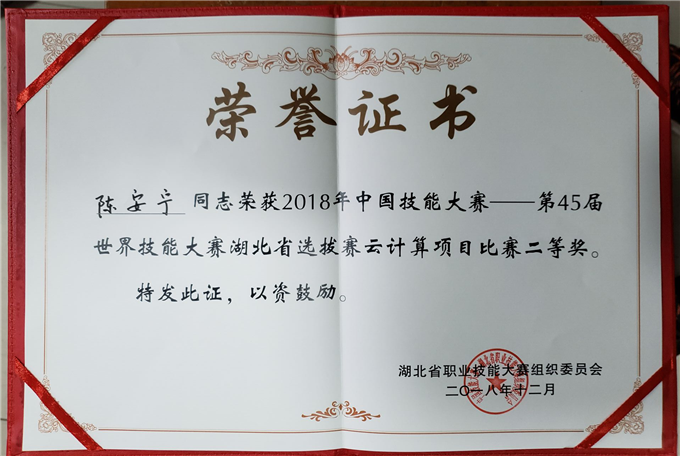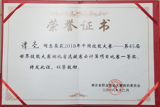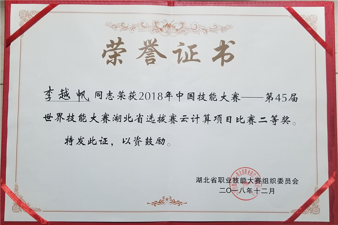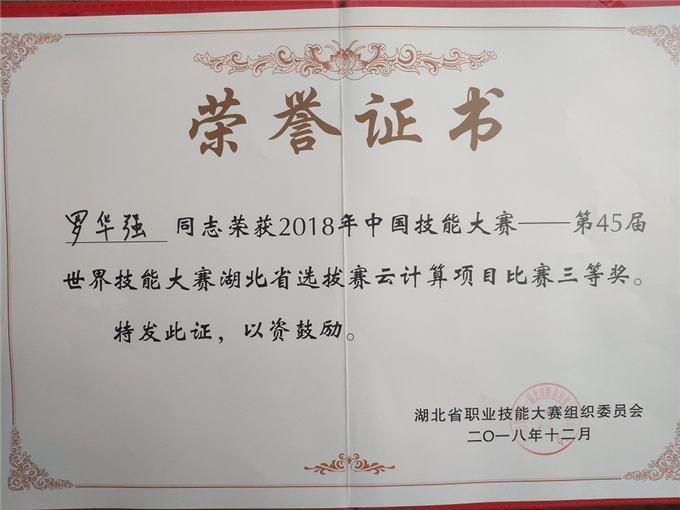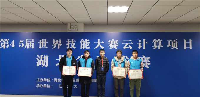 2018年12月22日,由湖北省人力资源和社会保障厅主办的第45届世界技能大赛云计算项目和网络安全项目湖北省选拔赛在江汉大学举行,来自全省的120名选手同台竞技。我校2017级计算机网络技术专业谭亮、李越帆、陈安宁、罗华强同学分别取得云计算赛项(个人)1项一等奖、2项二等奖、1项三等奖, 2018级信息安全管理专业赵小峰、涂凯威同学取得网络安全(团体)1项二等奖。