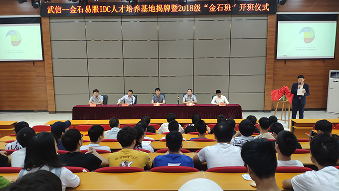 近日,我校信息工程系与金石易服(武汉)科技有限公司共建计算机网络技术专业“金石易服IDC人才培养基地”揭牌暨2018级“金石班”开班仪式在多功能厅顺利举行。信息工程系主任蔡明、金石易服仁知学院副院长余成,以及2018级“金石班”全体同学参加了仪式。