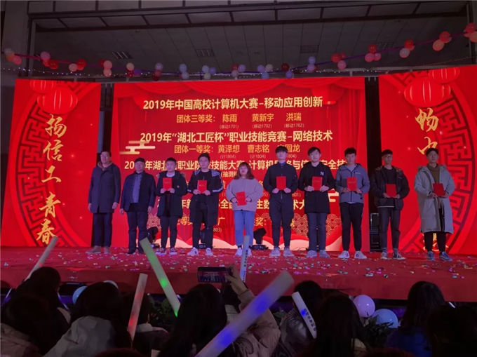 晚会进行中,校长许婷通过视频向信息工程学院全体师生送上新年祝福。信息工程学院院长蔡明上台作了致辞。他向同学们致以新年的问候,并深情回顾了信息工程学院在2019年各项工作所取得的骄人成绩。蔡明等同志为在2019年度各类职业技能大赛中取得优异成绩的十余位同学进行了颁奖。