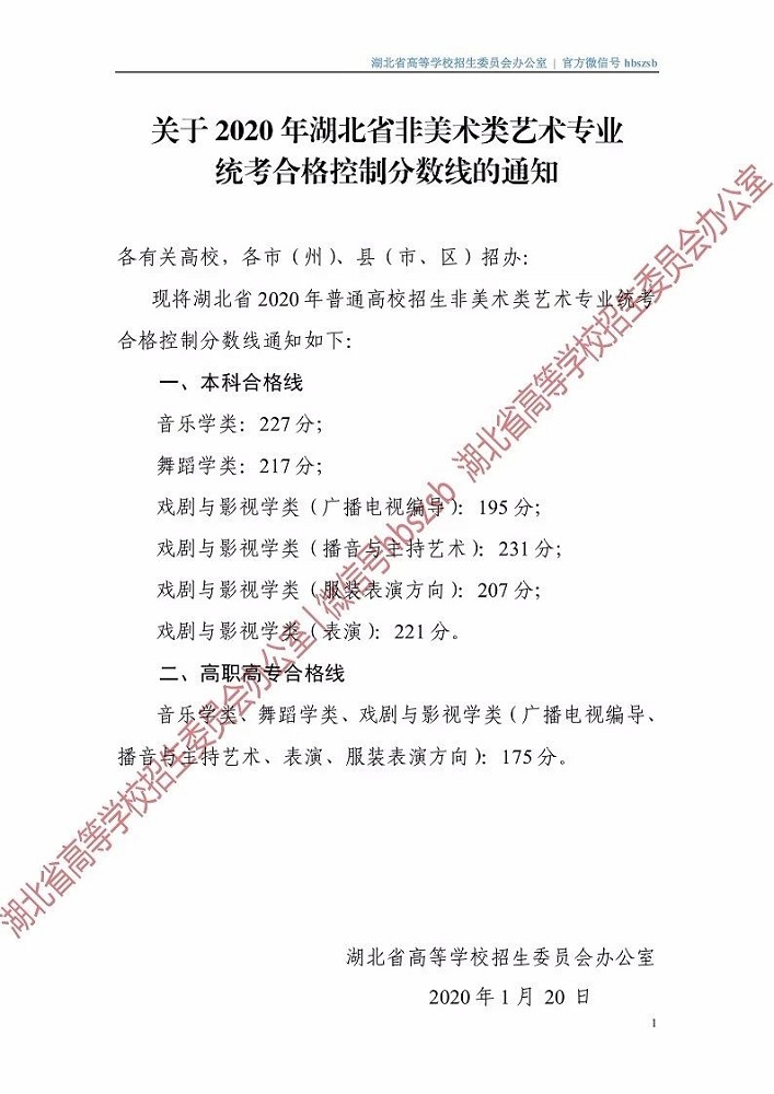 【普招.政策】关于2020年湖北省非美术类艺术专业统考合格控制分数线的通知