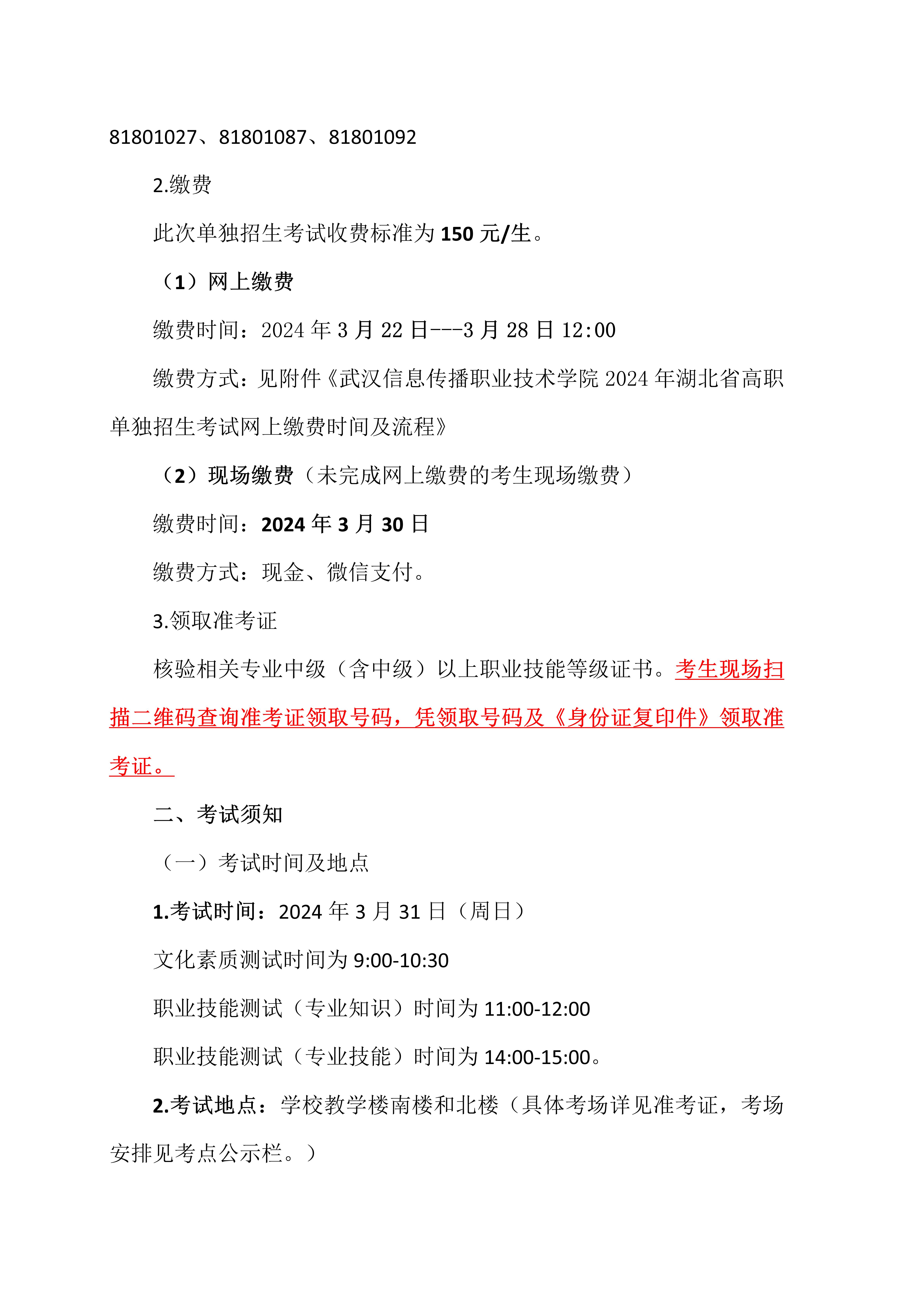 武汉信息传播职业技术学院2024年湖北省单独招生考试须知