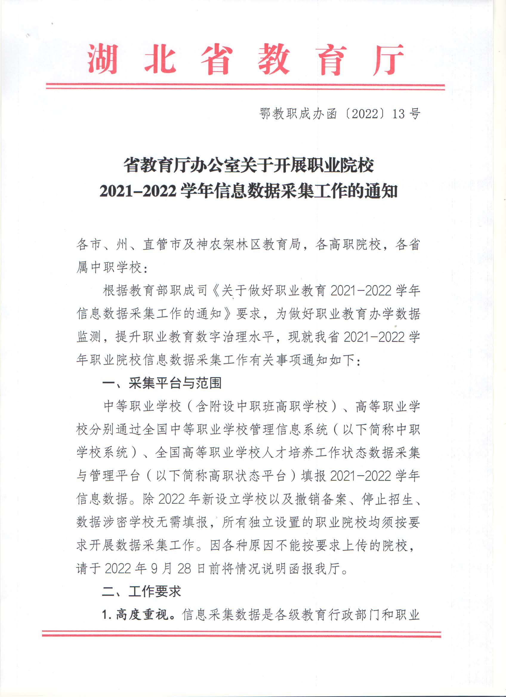 省教育厅办公室关于开展职业院校2021-2022学年信息数据采集工作的通知