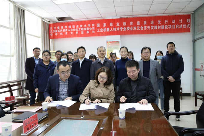 4月8日下午,我校智能制造工程学院工业机器人技术专业与华中科技大学出版社、武汉金石兴机器人自动化工程有限公司签约,正式启动校企“双元”合作开发规划教材建设项目。学校校长许婷、副校长孙翔,华中科技大学出版社总编辑姜新祺,武汉金石兴机器人自动化工程有限公司董事长李洪波,我校教务处、智能制造工程学院等相关负责人出席了启动仪式。