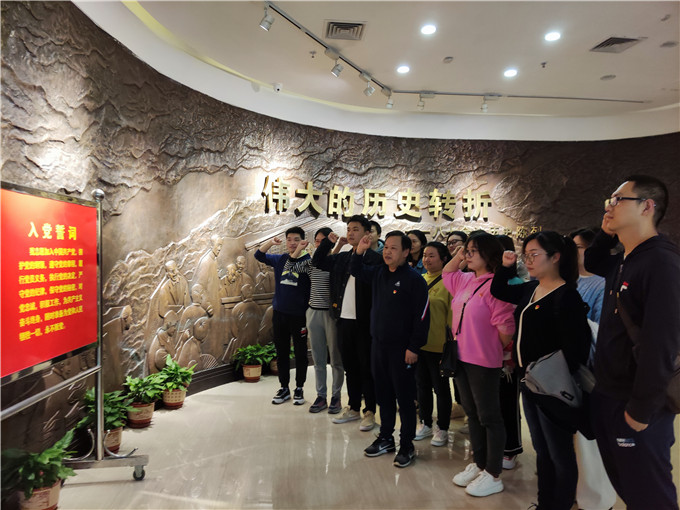 在纪念馆一楼展厅,学院总支书记熊伟斌同志带领全体党员面对鲜红的党旗,一起重温入党誓词,接受心灵的洗礼,叩问入党初心。